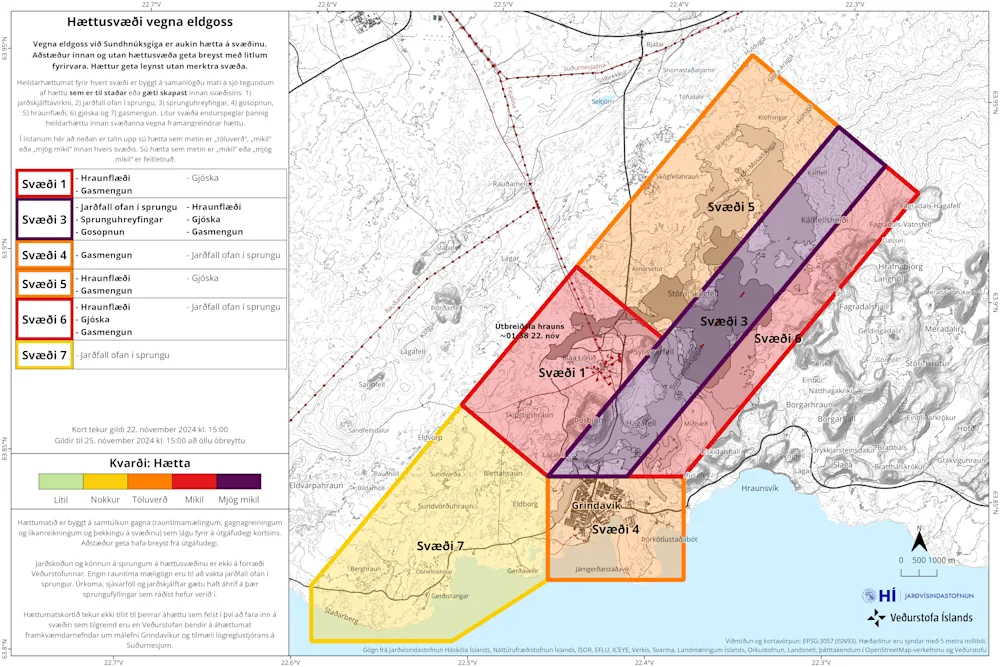 Veðurstofan uppfærði hættumat sitt fyrr í dag og gildir það til 25. nóvember 2024 að öllu óbreyttu. Virkni er í þremur gígum og er nokkuð stöðug síðan í gær. Töluvert hefur hægt á framrás hrauntungu við Svartsengi. Landsig mælist í Svartsengi.