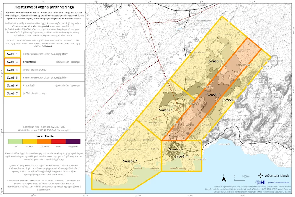 Sjöunda eldgosinu á Sundhnúksgígaröðinni lauk mánudaginn 9. desember 2024. Síðast sást virkni í gígnum um kl. sjö þann 8. desember sl. Eldgosið milli Stóra – Skógfells og Sýlingarfells hófst kl. 23:14 miðvikudaginn 20. nóvember sl. og stóð yfir í 18 daga. Landris er hafið á ný á Svartsengissvæðinu. Á meðan kvika heldur áfram að safnast fyrir undir Svartsengi eru auknar líkur á eldgosi. Nýjustu gögn Veðurstofu Íslands benda til þess að líkur á kvikuhlaupi og jafnvel eldgosi aukist í lok janúar 2025. Veðurstofan uppfærði hættumat fyrir svæðið í gær þann 14. janúar, sjá viðhengi. Það gildir að öllu óbreyttu til 28. janúar nk. og felur ekki í sér breytingar.