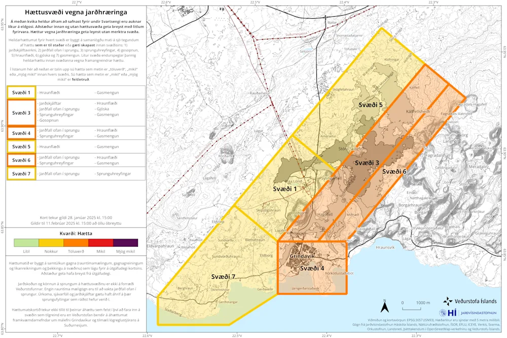 Í Grindavík er áhætta há fyrir alla hópa, bæði að nóttu sem degi. Á Svartsengissvæðinu er áhætta talin há, bæði að nóttu sem degi. Á gos-/sprengisvæði er áhættan hins vegar óásættanleg fyrir viðbragðsaðila, ráðgjafa og verktaka, ytri aðila og ferðafólk. Mælt er gegn því að óviðkomandi fari inn á gos- og sprengisvæði.