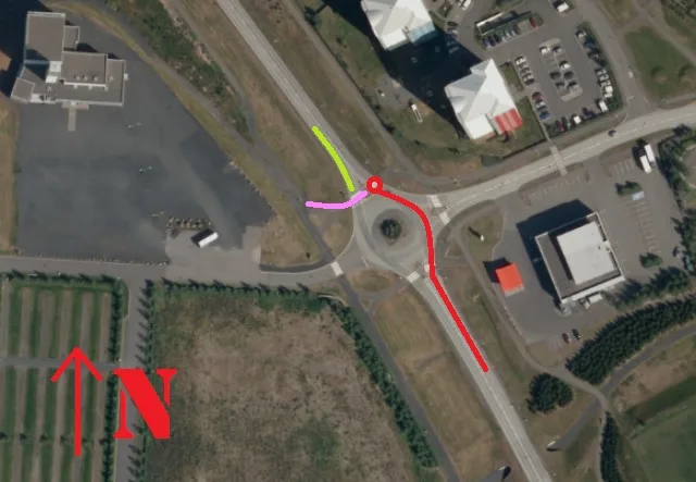 Hér er það hættulegt að gangbrautin er við hringtorgið. Ökumaður sem kemur að úr gagnstæðri átt á ekki möguleika á að sjá gangandi vegfarenda fyrr en hann er langt kominn í hringtorgið. Á sama tíma er ökumaður sem ekur um hringtorg að fylgjast vel með bílum í kring um sig og það dregur úr athygli á öðru á meðan.