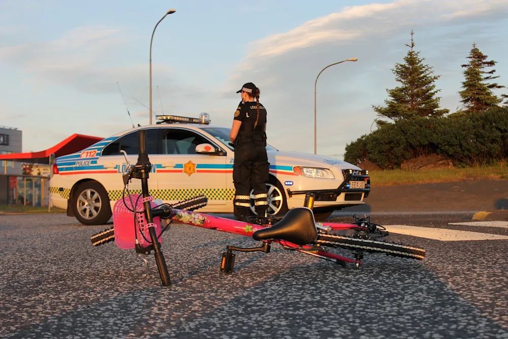 Myndin er sviðsett, en reiðhjólið er það sama og barnið var á.