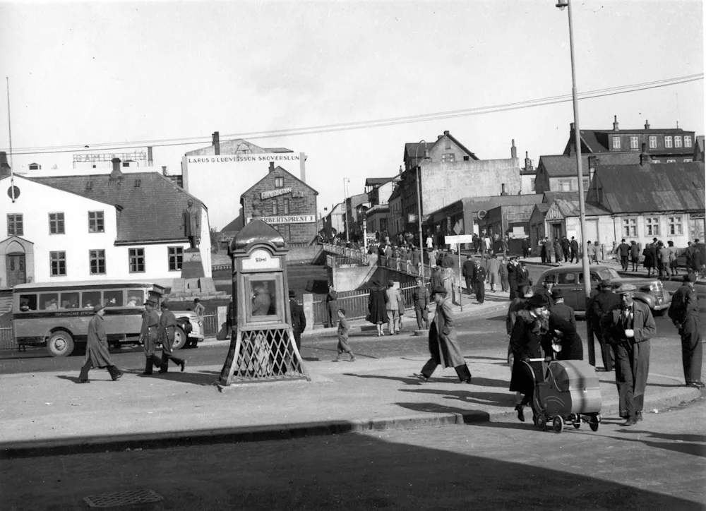 Á þessum fallega laugardegi drögum við fram gamla mynd, sem sýnir iðandi mannlíf í miðbænum. Hér eru margir á ferli, m.a. erlendir hermenn, en myndin er einmitt frá stríðsárunum eins og glöggir lesendur tóku strax eftir. Á þessum árum settu dátarnir mikinn svip á bæjarlífið, en það er fleira sem unga fólkinu á 21. öldinni kann að þykja eftirtektarvert á myndinni, t.d. glæsilegur símaklefi sem blasir við á henni miðri. Vonumst annars til að þið öll eigið góða helgi og minnum á það er ávallt betra að flýta sér hægt!