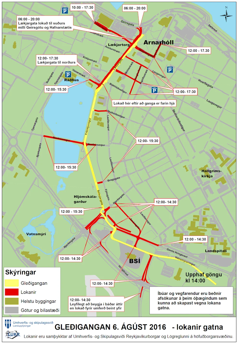 Laugardaginn 6. ágúst verður líf og fjör í miðborginni, en þá er hin árlega Gleðiganga Hinsegin daga á dagskrá. Gengið er frá Vatnsmýrarvegi (rétt hjá BSÍ) kl. 14 og að Arnarhóli, en þar tekur við hátíðardagskrá sem stendur til kl. 17.30. Vegna þessa verður nokkrum götum lokað í miðborginni, líkt og sjá má á meðfylgjandi mynd. Búast má við fjölmenni og því minnum við sérstaklega á þjónustu strætó, sem og bílastæðahúsin sem hafa ekki alltaf verið vel nýtt á þessum degi.