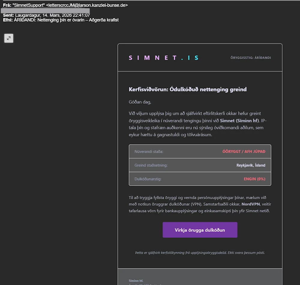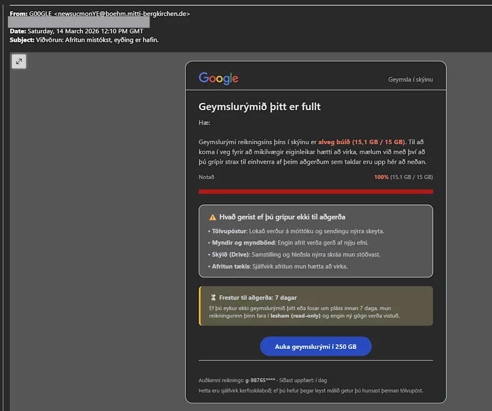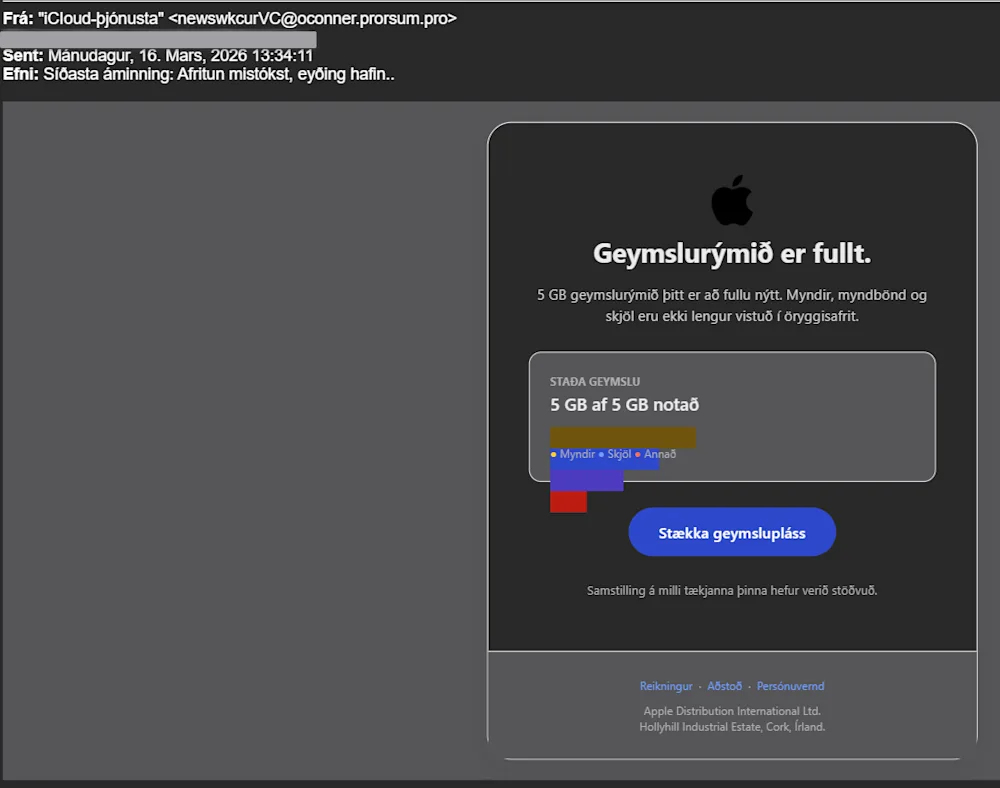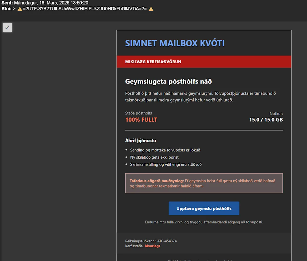 Undanfarið hafa netöryggissveitinni CERT-IS og lögreglunni borist fjöldi tilkynninga vegna grunsamlegra tölvupósta sem sendir hafa verið á íslenska notendur. Tölvupóstarnir eiga það allir sameiginlegt að vara fólk við að það muni verða fyrir tjóni ef það grípur ekki strax til aðgerða. Svikapóstarnir eru sendir í nafni þekktra þjónustufyrirtækja svo sem iCloud, Google og nafni íslenskra fjarskiptafyrirtækja. Dæmi um fyrirsagnir þeirra eru „Nettengingin þín er óvarin“, „Geymslan er full, Eyðing hafin“ og „Tafarlausra aðgerða krafist - gagnageymslan er full“.