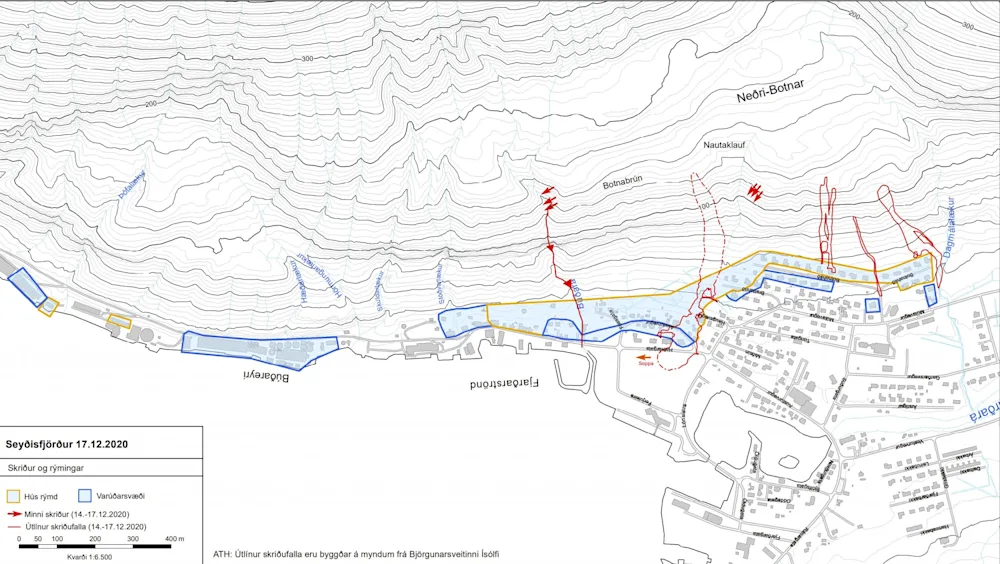 Veðurstofan mælir með áframhaldandi rýmingu á húsum á Seyðisfirði samkvæmt meðfylgjandi korti. Á kortinu eru einnig merkt varúðarsvæði þar sem mælt er með því að íbúar hafi varann á vegna hættu á aurskriðum. Mælt er með því að fólk dveljist ekki í eða gisti í kjöllurum eða á jarðhæð í herbergjum sem snúa upp í fjallshlíðina og gæti varúðar þegar farið er um utanhúss í grennd við þessa árfarvegi.