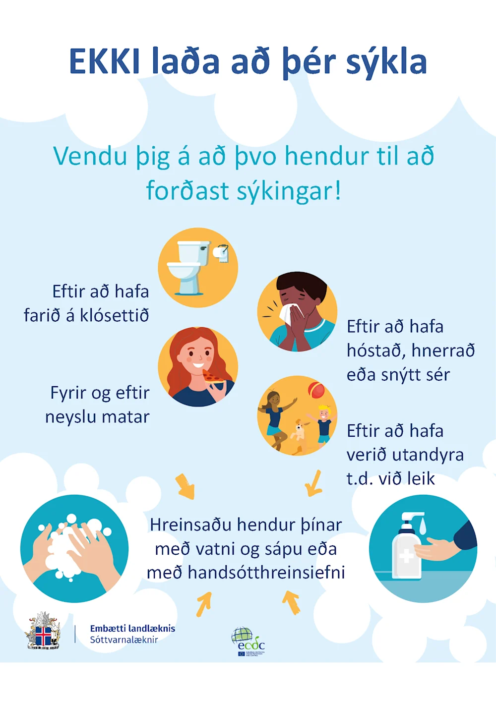 Dagurinn í dag, 5. maí, er alþjóðlegur handþvottadagur. Alþjóðaheilbrigðisstofnunin minnir á að handhreinsun skiptir gríðarlega miklu máli við að rjúfa smitleiðir sýkla. Í meðfylgjandi myndböndum frá Sóttvarnastofnun Evrópu (ECDC) er myndrænt minnt á hvernig sýklamengun getur dreifst frá einum til annars í daglegu lífi.