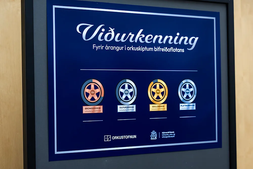 Viðurkenningin er í formi skafmiða og hugmyndin er að stofnanir skafi af henni eftir því sem tekst að auka hlutfall rafbíla í flotanum. Guðlaugur Þór ráðherra skóf af gullmerkinu fyrir hönd Umbru, þjónustumiðstöðvar Stjórnarráðsins, sem er komin langleiðina í orkuskiptunum. Gull fékk líka Lögreglustjórinn á Vesturlandi en þar er raforka nú yfir 90% af orkunotkun í bílaflotanum. Hjá Landi og skógi er nú um þriðjungshlutfall rafbíla af þeim bílum sem falla undir markmiðin og fékk stofnunin því brons.