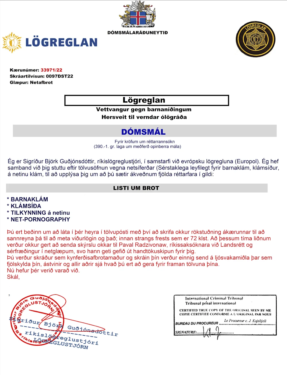 Lögreglu berast enn tilkynningar um tölvupóst skilaboð þar sem Sigríður Björk Guðjónsdóttir, ríkislögreglustjóri er ranglega titluð sendandi og skilaboðin eru ranglega merkt lögreglu, Europol og íslenskum ráðuneytum. Þessi skilaboð eru þó ekki frá ríkislögreglustjóra og viljum við vara fólk við að svara tölvupóstinum og við því að ýta á hlekki og viðhengi sem geta fylgt slíkum skilaboðum. Ef þú hefur fengið eða færð póst af þessum toga skaltu tilkynna hann sem ruslpóst/spam í póstforritinu þínu.