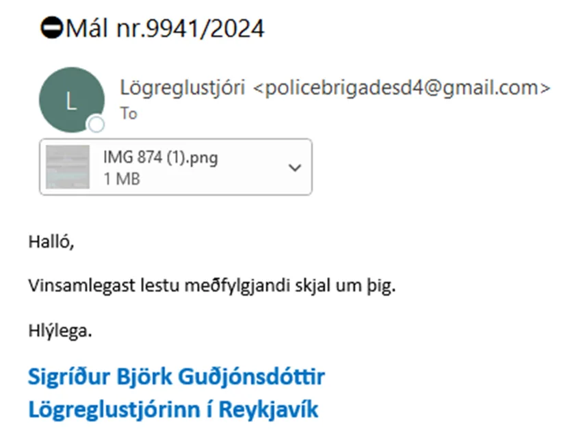 Embætti ríkislögreglustjóra berast nú aftur tilkynningar um tölvupóst þar sem Sigríður Björk Guðjónsdóttir ríkislögreglustjóri er ranglega titluð sem sendandi og skilaboðin ranglega merkt lögreglu.