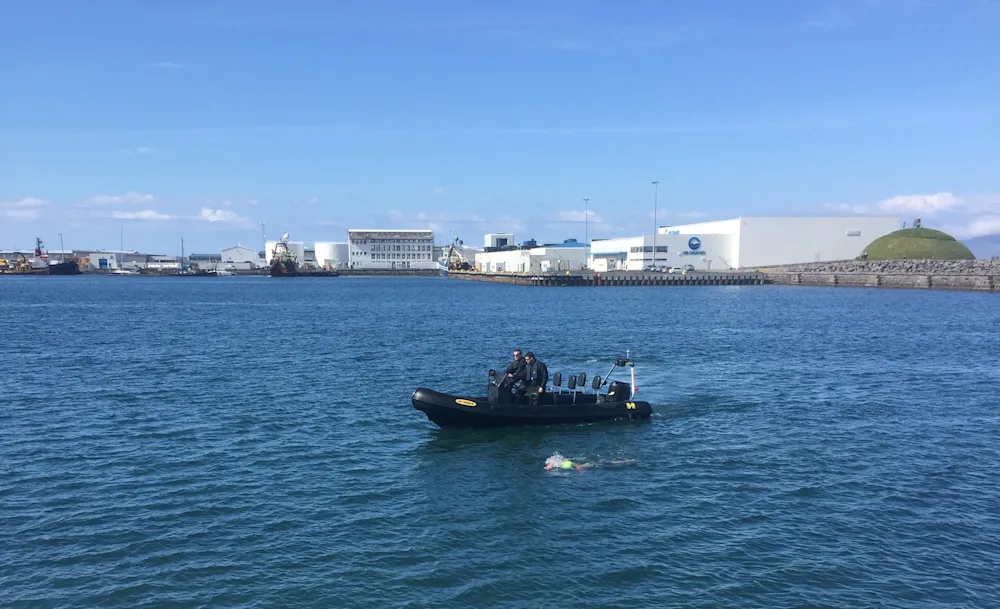 Jón að ljúka sundinu í Reykjavíkurhöfn ásamt fylgdarbáti sérsveitar