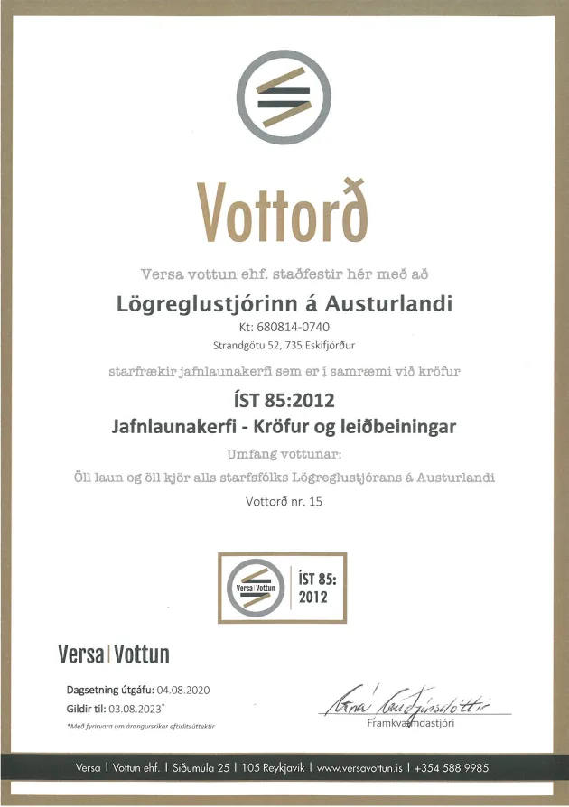 Þann 4. ágúst síðastliðinn fékk Lögreglustjórinn á Austurlandi jafnlaunavottun frá úttektar og vottunarfyrirtækinu Versa/Vottun. Á skjali sem afhent var af því tilefni kemur fram að embættið starfrækir jafnlaunakerfi í samræmi við kröfur IST 85:2012 og varða öll laun og öll kjör starfsfólks embættisins.