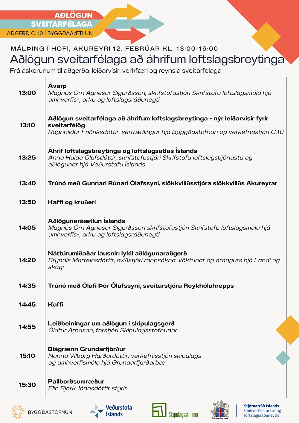 Málþingið er lokahnykkur í aðgerð C.10 í byggðaáætlun, Áhrif loftslagsbreytinga og sveitarfélög, sem Byggðastofnun hefur leitt í samstarfi við Veðurstofu Íslands, Skipulagsstofnun og umhverfis-, orku- og loftslagsráðuneytið. Þar verður m.a. kynnt fyrsta útgáfa leiðarvísis fyrir sveitarfélög um mótun aðlögunaraðgerða sem byggður er á tilraunaverkefnum í fimm sveitarfélögum, auk nýrrar aðlögunaráætlunar Íslands, Loftslagsatlas Íslands og fleiri verkfæra og leiðbeininga sem styðja sveitarfélög í aðlögunarvinnu.