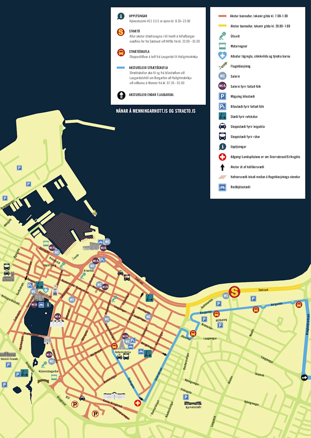 Enn og aftur er fólk hvatt til að nýta sér strætó og hinir, sem ætla að nota einkabílinn, til að leggja löglega. Það verður frítt í strætó á höfuðborgarsvæðinu á Menningarnótt og það ættu gestir á hátíðinni endilega að nýta sér. Jafnframt verður strætó með skutlþjónustu, sem ekur frá Laugardalshöll um Borgartún og Hlemm að Hallgrímskirkju og til baka. Strætóskutlan, það er líka frítt í hana, verður á ferðinni fram yfir miðnætti, eða þar til miðborgin hefur verið tæmd.