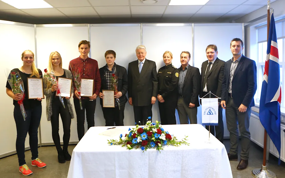 Frá undirritun Umferðarsáttmálans. Elín Jóna Þorsteinsdóttir, Þuríður Björg Björgvinsdóttir, Davíð Reynisson, Bjarni Máni Jónsson, Ólafur Ragnar Grímsson, Alda Hrönn Jóhannsdóttir, aðstoðarlögreglustjóri LRH, Þórólfur Árnason, forstjóri Samgöngustofu, Björgvin Þór Guðnason, form. Ökukennarafélags Íslands, og Orri Vignir Hlöðversson, framkvæmdastjóri Frumherja.