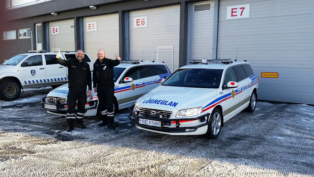 Lögreglumennirnir Árni og Pétur voru himinlifandi þegar bílarnir voru afhentir sl. föstudag.