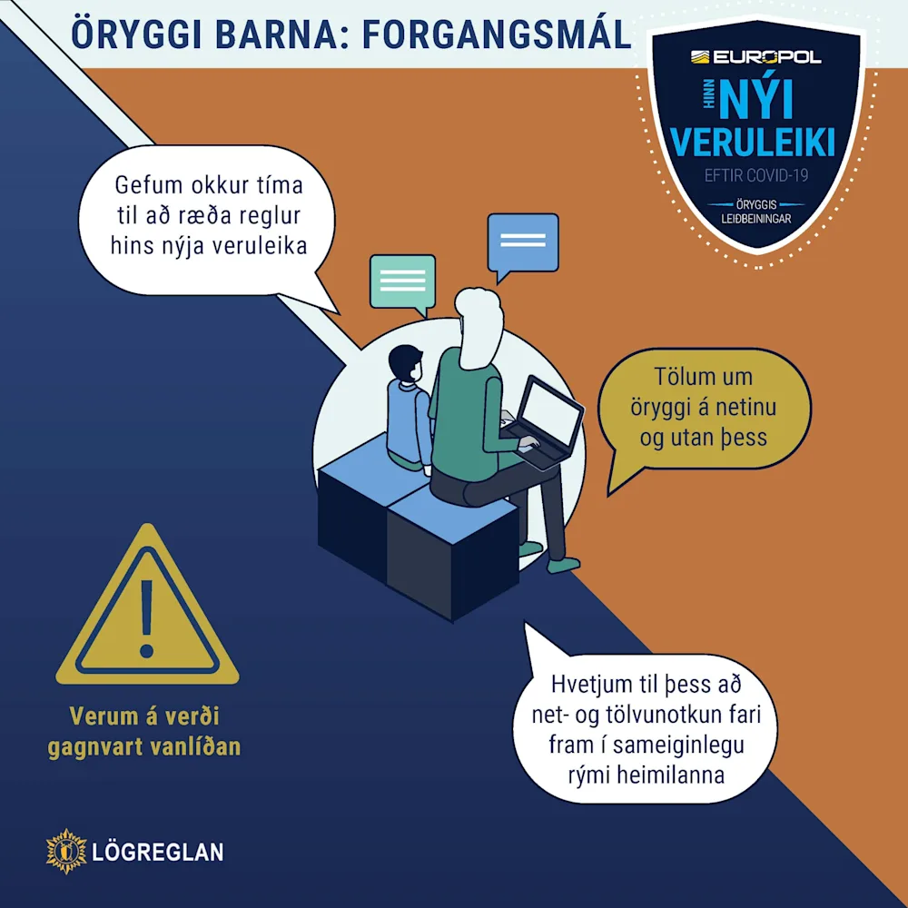 Europol hefur gefið út nokkrar nýjar leiðbeiningar sem þeir kalla „Hinn nýi veruleiki eftir Covid19“ – Hér fjalla þeir um öryggi barna á netinu. Setjumst niður með börnum okkar, ræðum við þau um hætturnar á netinu og fylgjumst með netnotkun þeirra. Við munum birta fleiri leiðbeiningar frá Europol á næstunni.
