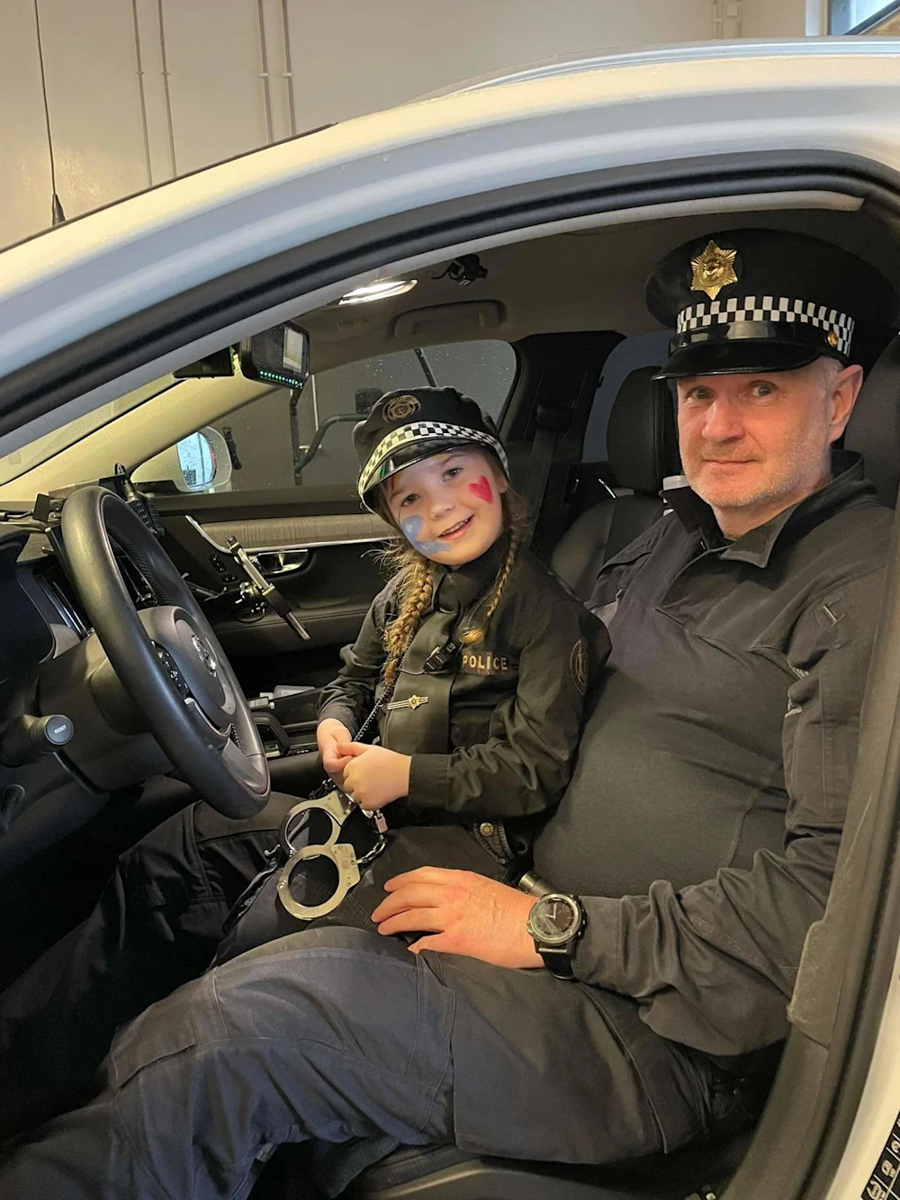 Yngsta kynslóðin hefur farið víða á öskudaginn og tekið lagið eins og venjan er. Þessi unga snót kom í heimsókn á eina af lögreglustöðvunum í umdæminu og gerði einmitt það. Varðstjórinn tók á móti henni og sagði það hafa verið skemmtilegasta verkefni dagsins, en gesturinn fékk m.a. að setjast inn í lögreglubíl og leiddist það ekki!