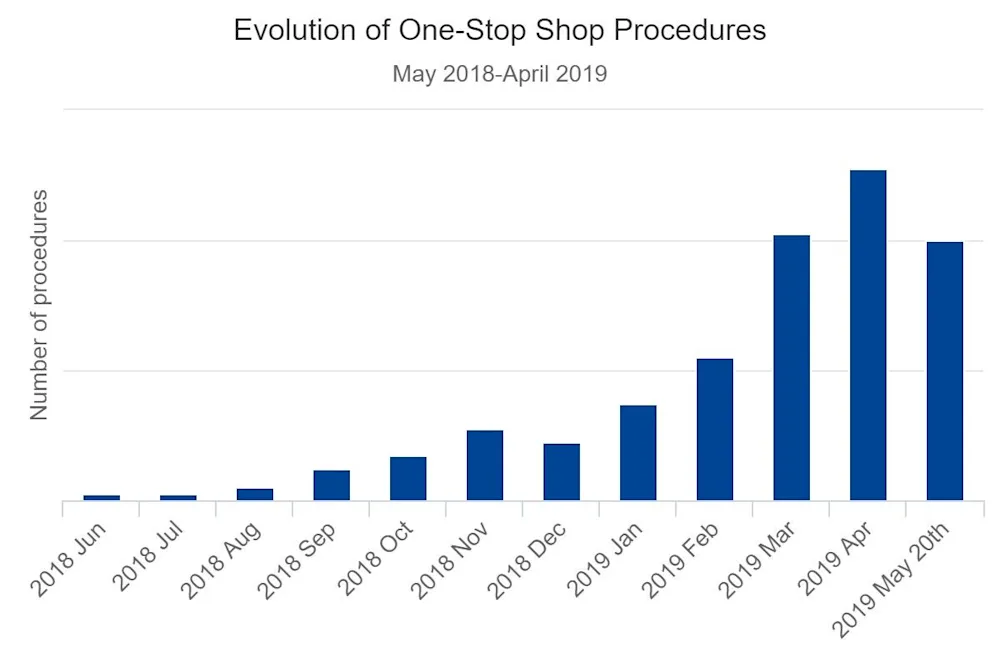 Frá fyrsta degi hafa mál er varða vinnslu persónuupplýsinga yfir landamæri verið skráð í samskiptakerfi ráðsins, svokallað IMI-kerfi, en á tímabilinu frá 25. maí 2018 til 30. apríl 2019 voru skráð 446 mál er vörðuðu vinnslu yfir landamæri. 205 þeirra hafa leitt til þess að kerfi eins afgreiðslustaðar (e. one stop shop procedure) var virkjað og af þeim hefur 19 málum verið lokið.