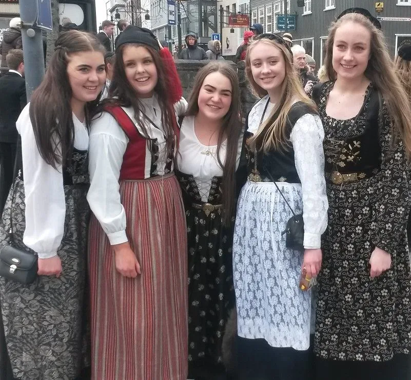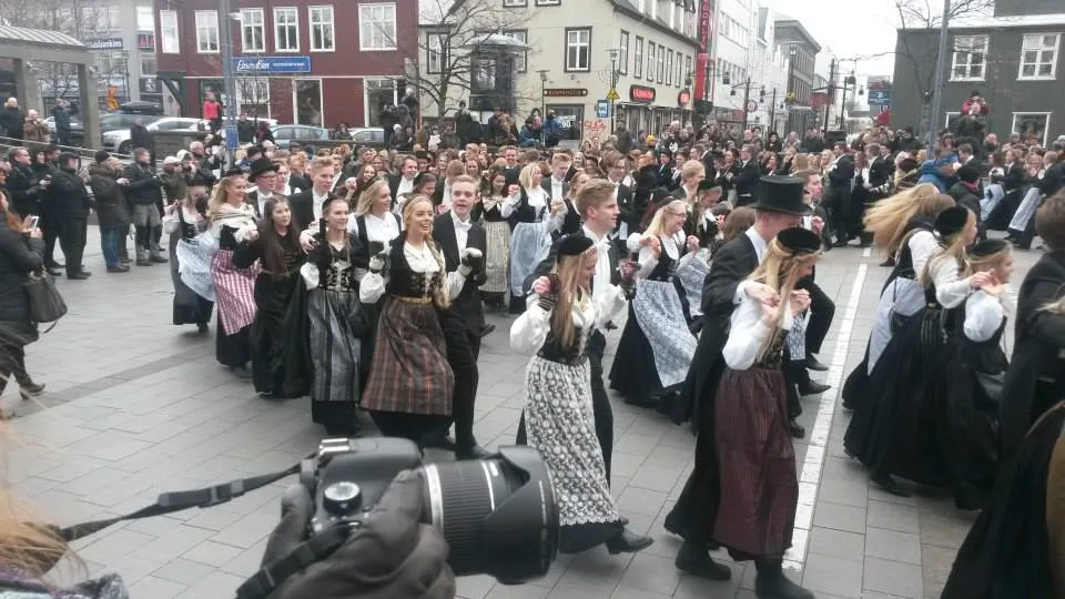 Nemendur í Verzlunarskóla Íslands létu hráslagalegt veður ekki aftra sér í dag, en í hádeginu skunduðu þeir í miðborgina á árlegum peysufatadegi skólans. Þar var stiginn dans, líkt og löng hefð er fyrir, gestum og gangandi til mikillar ánægju. Lögreglan var á staðnum og hafði einkar gaman af. Hinir prúðbúnu nemendur eru á öðru ári í Verzlunarskólanum, en eftir skemmtun dagsins tekur próflesturinn við.