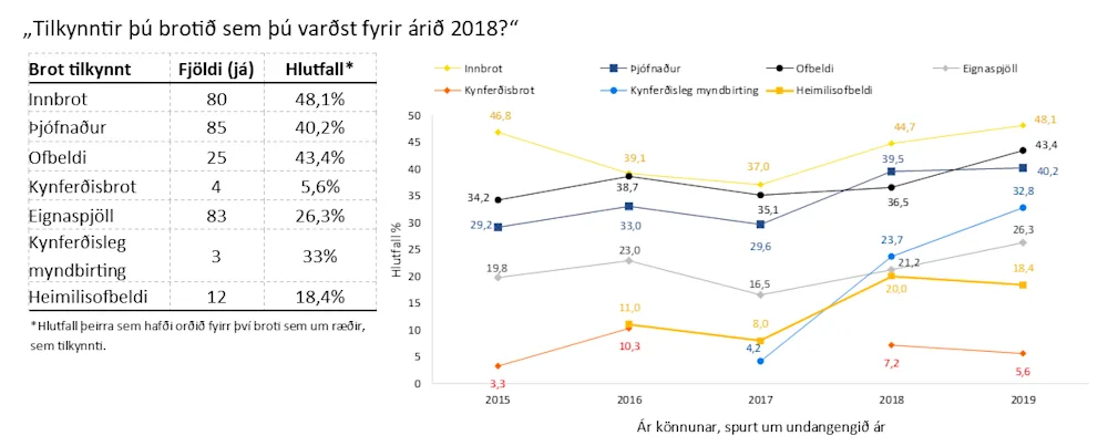 Hlutfallslega tilkynntu flestir innbrot, eða 48%, sem er það hæsta síðan árið 2013. Næst flestir tilkynntu ofbeldisbrot, eða 43,4% og þar á eftir þjófnað, um 40%. Þá tilkynntu 26% eignaspjöll. Hlutfallið jókst á milli ára í öllum þessum brotaflokkum, mest í tilvikum ofbeldisbrota og næst mest í eignaspjöllum.Af þeim sem urðu fyrir heimilisofbeldi voru 18,4% sem sögðust hafa tilkynnt brotið til lögreglu sem er lækkun um u.þ.b. 1,5 prósentustig frá árinu áður. Marktækur munur var á svörum karla og kvenna en enginn karlmaður sagðist hafa tilkynnt það heimilisofbeldi sem hann varð fyrir árið 2018. Aðeins rétt rúmur fjórðungur kvenna sagðist hafa tilkynnt brotið til lögreglunnar.