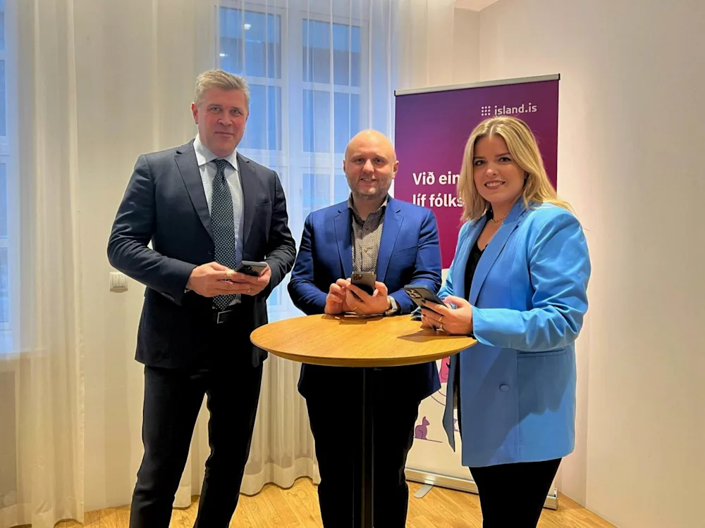 Bjarni Benediktsson, fjármála- og efnahagsráðherra, Andri Heiðar Kristinsson, framkvæmdastjóri Stafræns Íslands, og Áslaug Arna Sigurbjörnsdóttir, háskóla-, iðnaðar- og nýsköpunarráðherra, undirrituðu samninginn rafrænt.