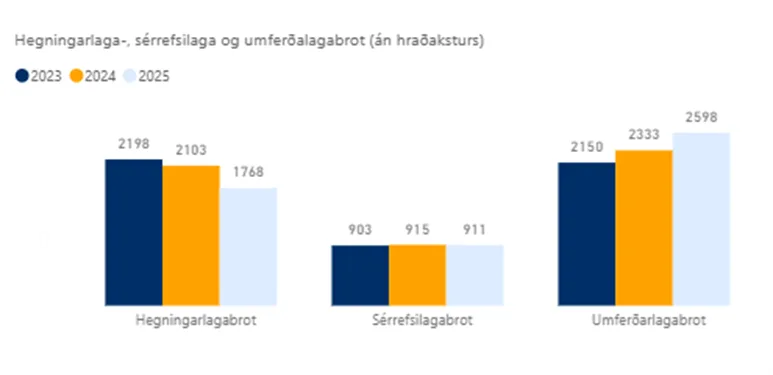 Heilt yfir voru 1.768 brot skráð þar sem grunur var um brot á almennum hegningarlögum um helgar í sumar. Þau voru 18% færri um helgar miðað við meðalfjölda árin 2023-2024 en til samanburðar voru slík mál yfir 2.100 bæði árið 2023 og 2024. Helst má rekja færri hegningarlagabrot til færri þjófnaða og innbrota (622 brot ), eignaspjalla (276 brot) og minniháttar líkamsárása (243 brot) en fækkunin var á bilinu 20-24% í hverjum brotaflokki milli ára.