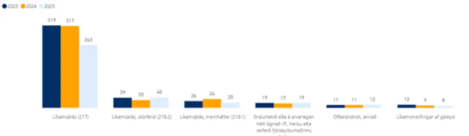 Kynferðisbrot voru jafn mörg og síðustu tvö ár en tilkynningar um nauðganir færri, eða 17 árið 2025, samanborið við 22 mál árlega 2024 og 2023 – sem jafngildir 23% fækkun frá fyrri árum.