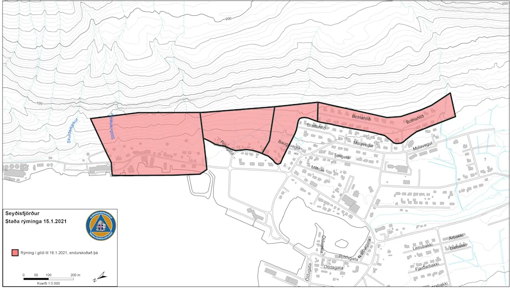 Szef policji we wschodniej Islandii, w porozumieniu z islandzkim Biurem Meteorologicznym i Krajowym Komisarzem Policji, z powodu prognozy związanej z opadami podjął decyzję o ewakuacji następujących obszarów w Seyðisfjörður. Ewakuacja zakończy się dziś wieczorem o godz 22.