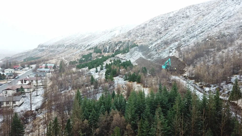 Frá hreinsunarstarfi á Seyðisfirði og uppbyggingu varnarmannvirkja. Mynd tekin 19. janúar 2021