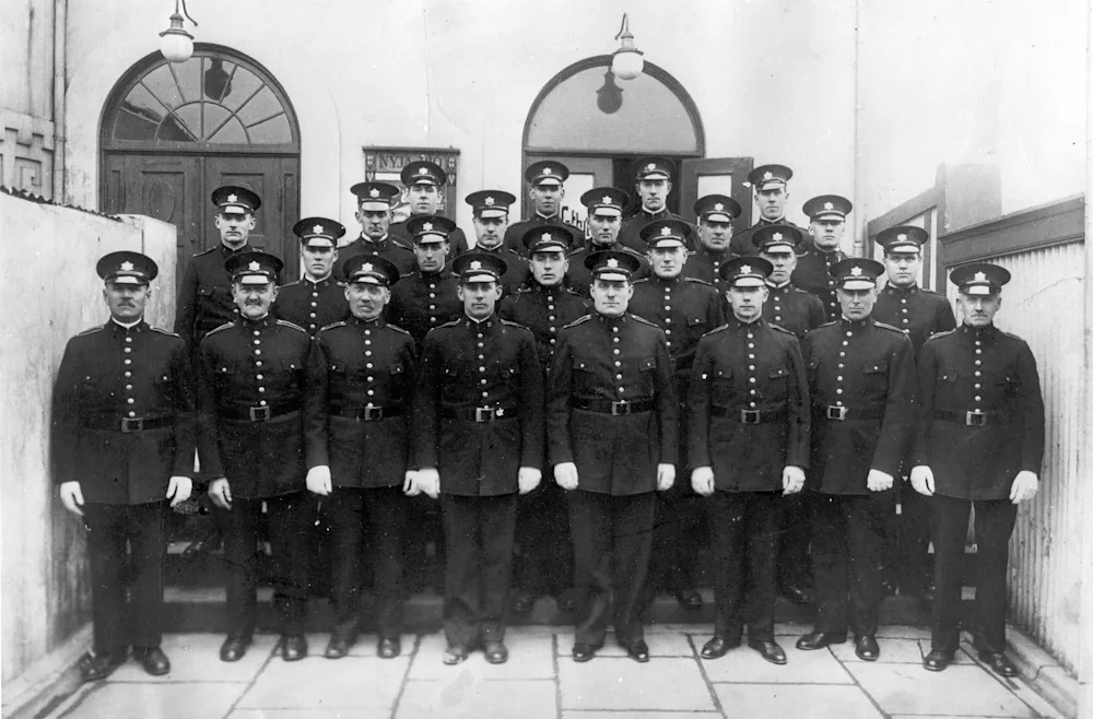 Í upphafi fjórða áratugarins fékk lögreglan nýjan búning og var myndin tekin við það tækifæri á tröppunum við Nýja Bíó.Fremsta röð: Þórður Geirsson, Guðmundur Stefánsson, Ólafur Jónsson, Ágúst Jónsson, Margrímur Gíslason, Guðbjörn Hansson, Sæmundur Gíslason og Kristján Jónasson.Önnur röð: Sigtryggur Eiríksson, Skúli Sveinsson, Matthías Guðmundsson, Sigurður Gíslason, Magnús Eggertsson og Ingólfur Þorsteinsson.Þriðja röð: Guðlaugur Jónsson, Sigurður Ingvarsson, Björn Vigfússon, Magnús Sigurðsson, Karl Guðmundsson og Magnús P Hjaltested.Aftasta röð: Geir Finnur Sigurðsson, Stefán Thorarensen, Jakob Björnsson og Matthías Sveinbjörnsson.