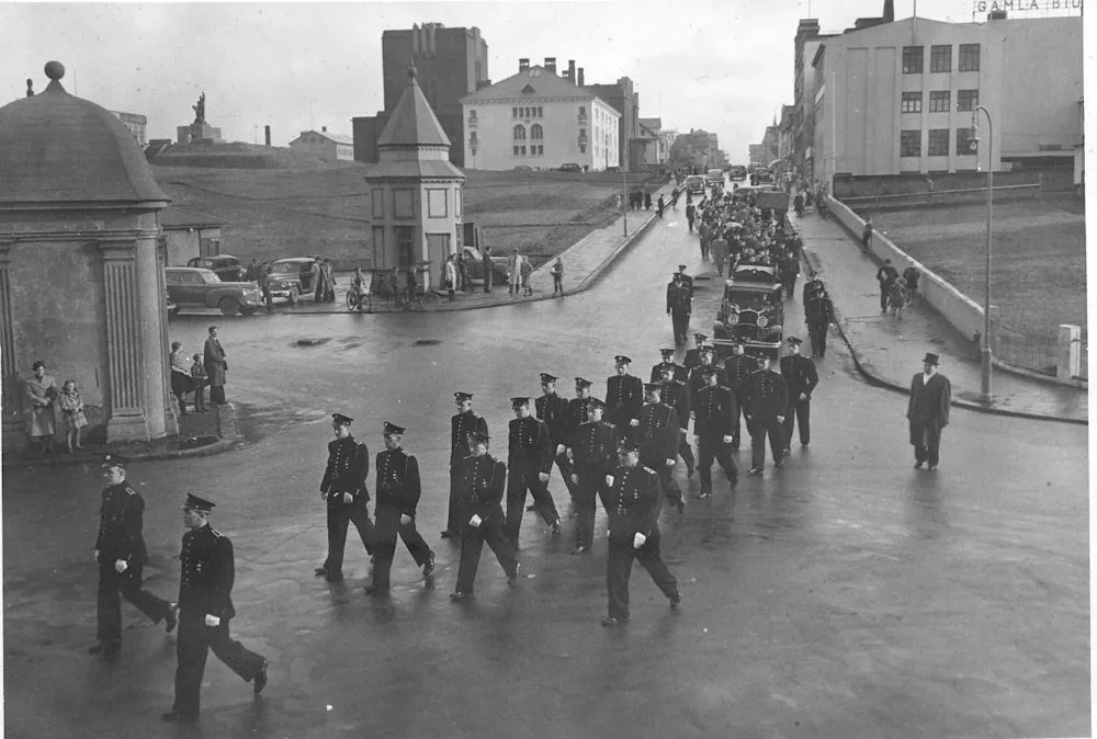 Lögreglufylgd við útför Geirs Sigurðssonar lögreglumanns um vorið árið 1937 þar sem gengið var niður Hverfisgötu.