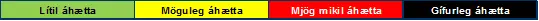 Líkan löggæsluáætlunar kveður á um fjögur áhættustig. Þau eru: lítil áhætta, möguleg áhætta, mjög mikil áhætta og gífurleg áhætta. Þeim er lýst eftir alvarleika sem grænu, gulu, rauðu og svörtu.