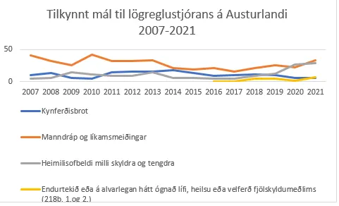 Greining gagna er undirstaða svæðisbundna samráðsins um afbrotavarnir. Á þeim grunni er hægt að meta hver m.a. hver er þróun afbrota, heita reiti og mögulegan vanda í uppsiglingu. Hér má sjá yfirlit yfir tilkynnt mál um kynferðisbrot, heimilisofbeldi og ítrekað ofbeldi í nánu sambandi á tímabilinu 2007-2021 hjá lögreglustjóranum á Austurlandi.