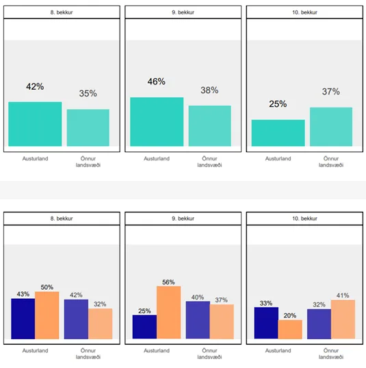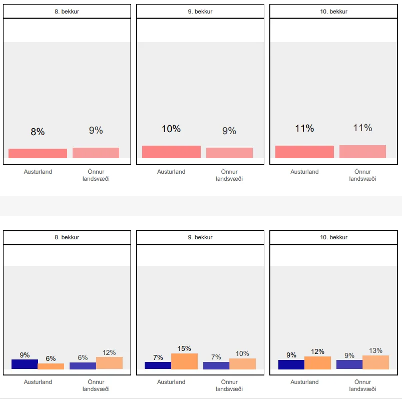 Í uppbyggingu á svæðisbundnu samráði um afbrotavarnir er lögð sérstök áhersla á börn og ungmenni. Þar sem þolendakönnun lögreglunnar nær ekki til barna er horft til samvinnu við Íslenskar æskulýðsrannsóknir og Rannsóknir&greiningu um upplýsingar um brot sem börn kunna að verða fyrir. Hér má sjá samanburð á gögnum lögreglu og R&G úr könnuninni 2022 fyrir Austurland og á landsvísu.