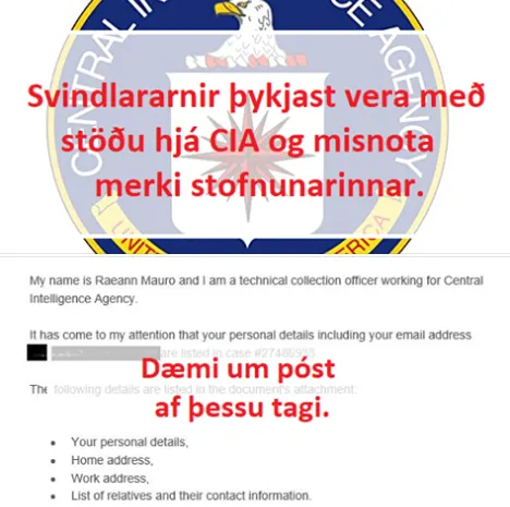 Lögreglunni á höfuðborgarsvæðinu hafa verið að berast tilkynningar um tölvupóst, sem er nýtt form af netglæp. Látið er líta út fyrir að viðtakandi póstsins tengist rannsókn CIA á barnaklámi, eins ógeðfellt og það nú er. Þetta er fjölpóstur og ekki hafa áhyggjur, honum fylgir ekki óværa og því óþarfi að bregðast við. Pósturinn er sendur til að vekja hræðslu í von um að fólk borgi af ótta, en ekkert er hæft í efni póstsins. Ef vel er að gáð má sjá að pósturinn er uppruninn í Gabon, Malí eða öðru ríki og hefur ekkert með CIA að gera.