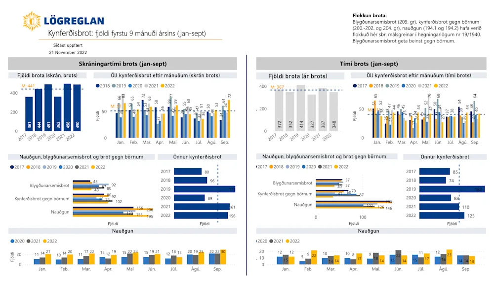 Ný skýrsla ríkislögreglustjóra um kynferðisbrot hefur verið birt á vefsvæði lögreglunnar. Í skýrslunni má finna upplýsingar um tilkynningar til lögreglu vegna kynferðisbrota fyrstu níu mánuði ársins. Lögreglan skráði tilkynningar 195 nauðganir fyrstu níu mánuði ársins 2022, sem samsvarar 26% fjölgun frá því í fyrra. Að meðaltali eru núna skráðar tilkynningar um 22 nauðgun á mánuði hjá lögreglunni.