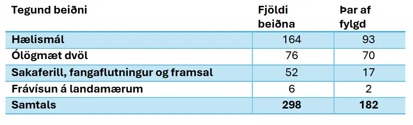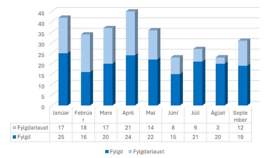 Loknum málum heimferða- og fylgdadeildar RLS hefur fjölgað frá fyrra ári, sé litið til fyrstu níu mánaða ársins 2025. Alls fóru 298 útlendingar úr landi í fylgd lögreglu á því tímabili, sem jafngildir að meðaltali 33 málum á mánuði. Á sama tímabili árið 2024 voru málin 248, eða að meðaltali 27,5 á mánuði.