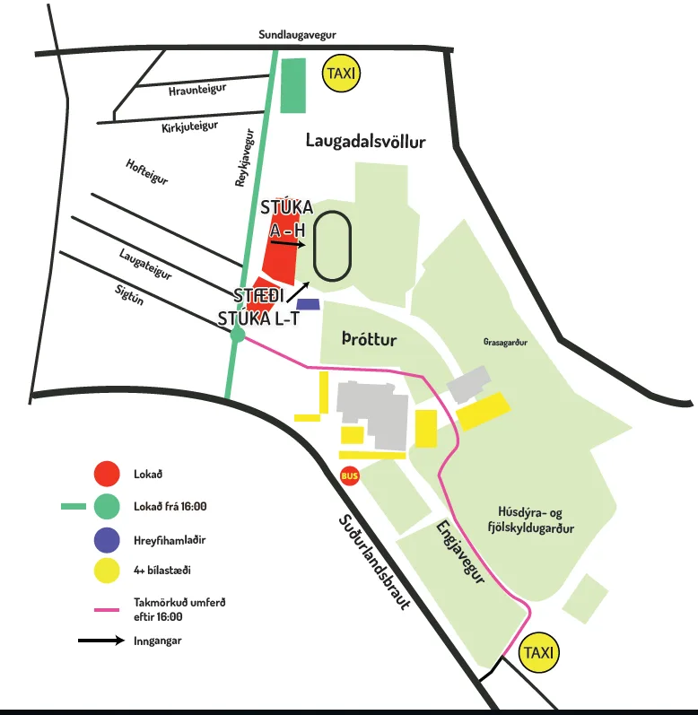 Þúsundir gesta eru væntanlegir á tónleika hljómsveitarinnar Guns N‘ Roses á Laugardalsvellinum í kvöld og því mikilvægt að fólki gefi sér góðan tíma til að komast á staðinn og eins aftur heim að tónleikunum loknum. Búast má við mikilli umferð á svæðinu og í næsta nágrenni og því nauðsynlegt að ökumenn sýni þolinmæði. Nokkrum götum verður lokað, eða umferð um þær takmörkuð meðan á þessu stendur. Sjá má nánar um það á meðfylgjandi korti, sem tónleikahaldarar hafa sent frá sér. Athygli er vakin á gulmerktum bílastæðum, en þau eru einvörðungu ætluð ökutækjum sem í eru minnst fjórir miðahafar á tónleikana. Sem fyrr mælum við hins vegar sérstaklega með því að fólk taki strætó á Laugardalsvöllinn, en boðið verður upp á hraðferðir frá þremur stöðum í borginni, þ.e. Háskólanum í Reykjavík, Mjóddinni og biðstöð norðanmegin við Kringluna (hjá Orkunni). Eftir tónleikana verður Suðurlandsbraut, á milli Grensásvegar og Kringlumýrarbrautar, lokað til að greiða fyrir umferð strætisvagna. Um leið og við minnum á veðurspána, sem gerir ráð fyrir einhverri vætu og því best að búa sig í samræmi við það, óskum við tónleikagestum góðrar skemmtunar á Laugardalsvelli í kvöld.