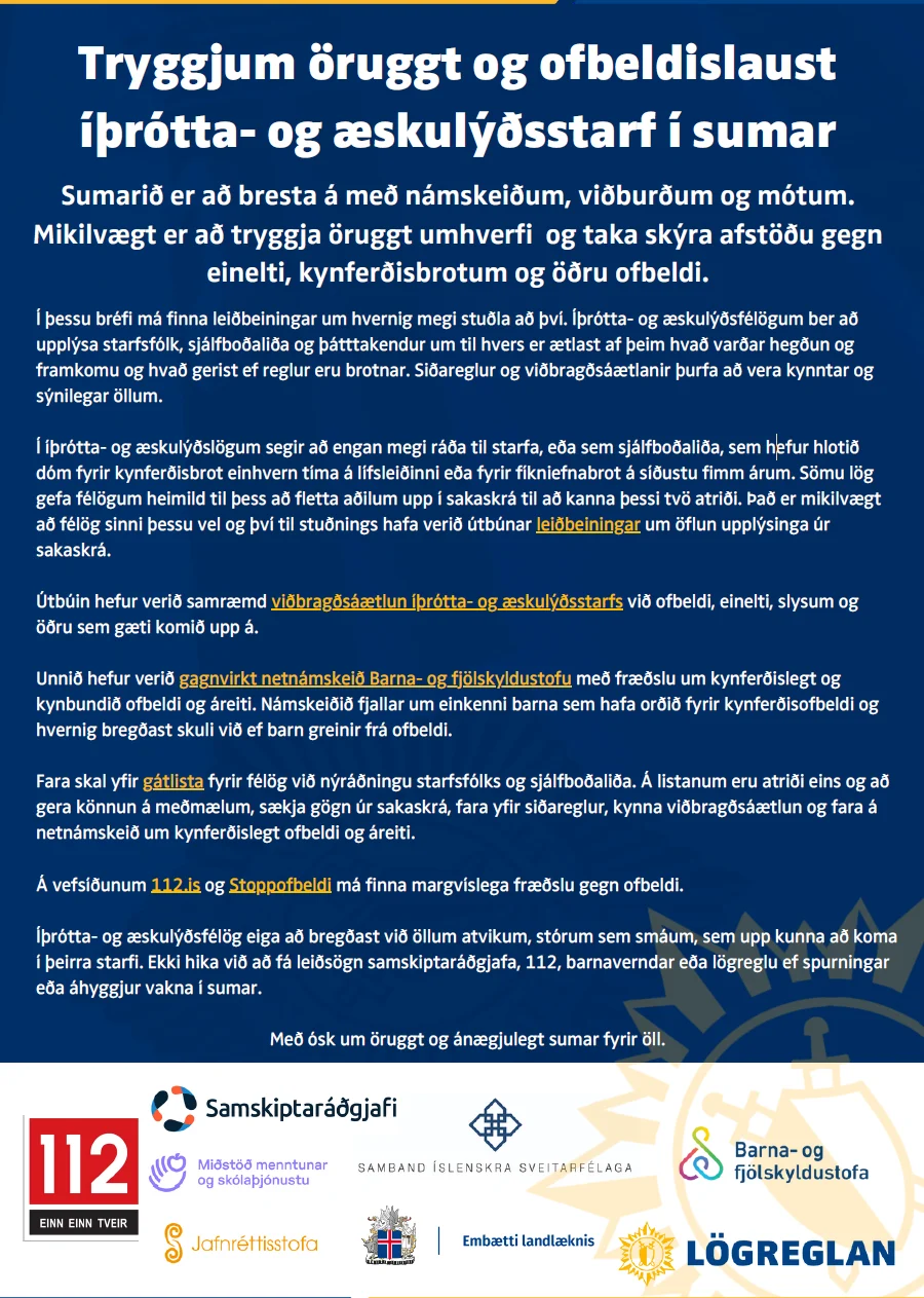 Í sumar eru ýmsar samkomur, viðburðir og mannamót þar sem börn taka þátt. Því er mikilvægt að skipuleggjendur og framkvæmdaraðilar íþrótta- og æskulýðsstarfs séu meðvitaðir um sameiginlega ábyrgð á að koma í veg fyrir ofbeldi, og séu með skýra ferla ef ofbeldi á sér stað. Við minnum á að leita má ráða eða leiðsagnar hjá samskiptaráðgjafa íþrótta- og æskulýðsstarfs um samskipti.