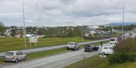 Tvö umferðarslys voru tilkynnt fimmtudaginn 14. júní. Kl. 14.37 var vörubifreið ekið norður Reykjanesbraut og aftan á tvær kyrrstæðar bifreiðir sunnan gatnamóta Bústaðavegar. Ökumaður og farþegi í einni bifreiðinni voru fluttir á slysadeild. Og kl. 18.02 varð árekstur með vespu, sem var ekið suður Skipasund, og bifreið, sem var ekið vestur Holtaveg. Ökumaður og farþegi vespunnar voru fluttir á slysadeild.