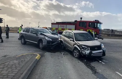 Fimmtudaginn 28. mars kl. 14.15 varð árekstur með bifreið, sem var ekið afrein Reykjanesbrautar til suðurs og beygt austur Breiðholtsbraut, og tveimur bifreiðum, sem var ekið vestur Breiholtsbraut og beygt áleiðis að frárein að Reykjanesbraut til suðurs. Tveir ökumannanna voru fluttir á slysadeild.