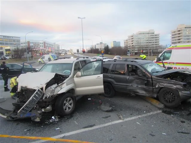 Miðvikudaginn 16. desember kl. 11.21 varð tveggja bíla árekstur á gatnamótum Kringlumýrarbrautar, Laugavegar og Suðurlandsbrautar. Í aðdragandanum var annarri bifreiðinni ekið norður Kringlumýrarbraut, en hinni suður Kringlumýrarbraut og hugðist ökumaður hennar beygja til vinstri og aka austur Suðurlandsbraut. Sá síðarnefndi er grunaður um að hafa ekið gegn rauðu ljósi. Annar ökumannanna var fluttur á slysadeild, en hinn ætlaði sjálfur að leita sér læknisaðstoðar.