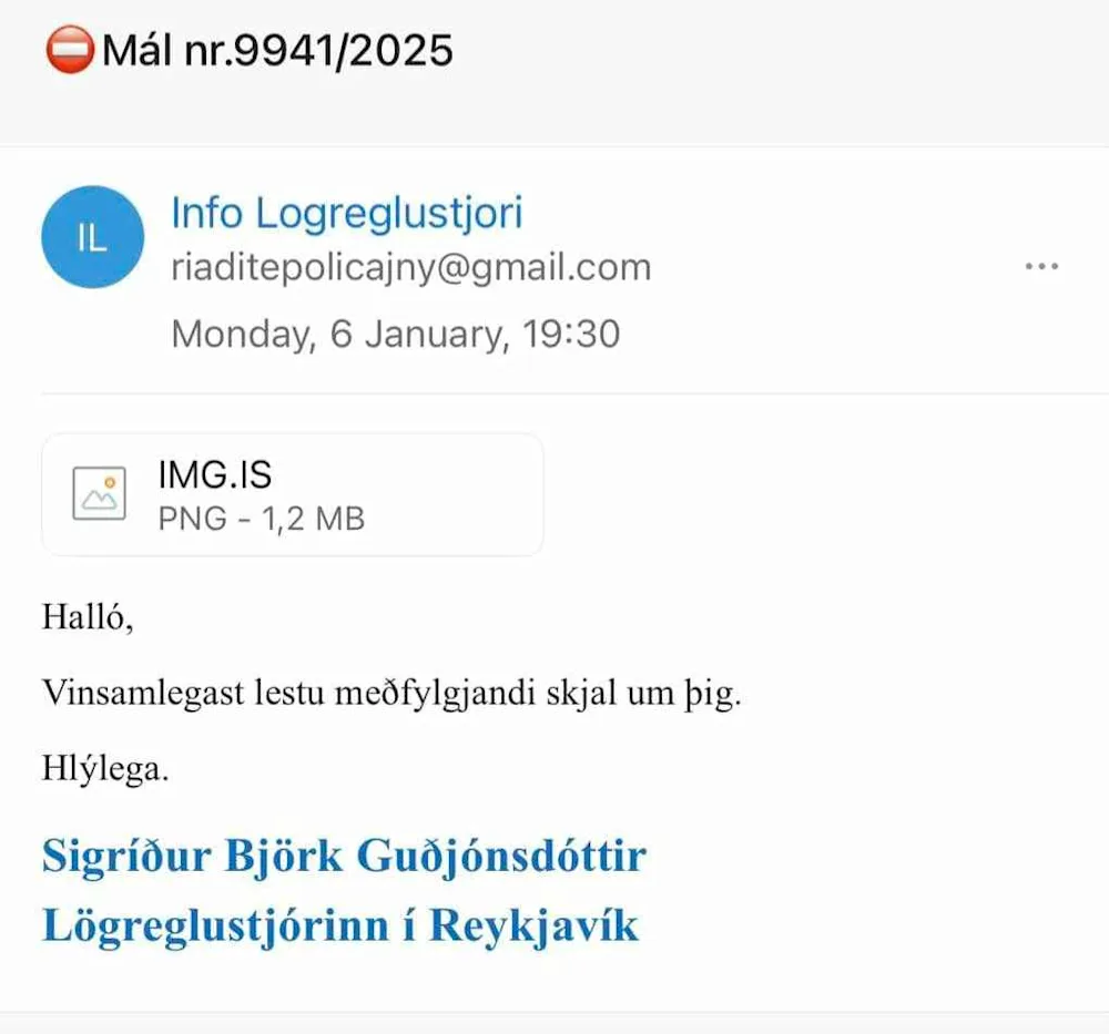 Við vekjum athygli á því að skilaboðin eru ekki frá ríkislögreglustjóra eða lögreglu og viljum við vara fólk við að svara tölvupóstinum og við því að ýta á hlekki og viðhengi sem geta fylgt svikapóstum sem þessum.