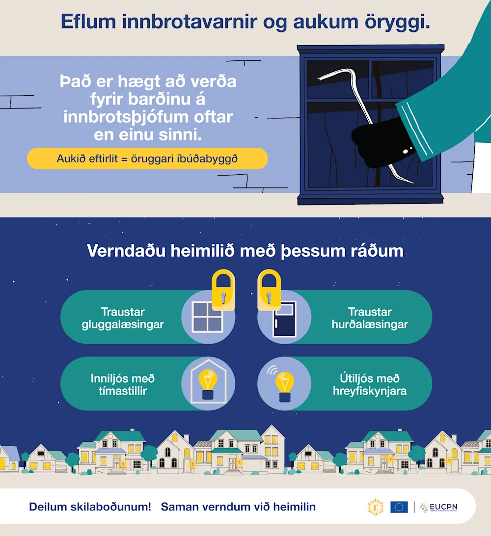 Að þessu sinni eru afbrotavarnir áfram í brennidepli, en sjónum er beint að því hvernig megi koma í veg fyrir innbrot á heimili. Lögreglan hefur ítrekað nefnt ýmsar leiðir í þeim efnum, en á meðfylgjandi mynd er mikilvægi þess að hafa traustar hurðalæsingar, útiljós með hreyfiskynjara, traustar gluggalæsingar og inniljós með tímastillir haldið á lofti.