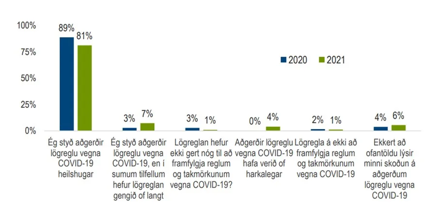 Stuðningur við aðgerðir lögreglu vegna COVID 19: Þátttakendur voru m.a. spurðir um skoðun sína á aðgerðum lögreglu við að framfylgja reglum og takmörkunum vegna COVID-19 en þessi spurning var einnig lögð fyrir vorið 2020. Sjá má að þegar horft er til alls landsins þá studdi mikill meirihluti landsmanna aðgerðir lögreglu vegna COVID-19 heilshugar, eða 81% í könnun 2021, en hlutfallið var 89% árið 2020. Þá taldi mjög lítill hluti, eða 4% landsmanna, að aðgerðir lögreglu vegna Covid-19 væru of harkalegar.