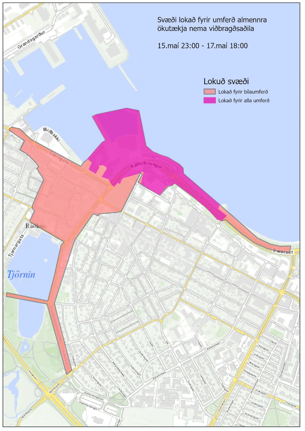 Allri vörulosun innan lokaða svæðisins skal vera lokið fyrir kl. 11.00 mánudaginn 15. maí og verður ekki hægt að fá afhentar vörur með bíl innan svæðisins fyrr en eftir kl. 18.00 miðvikudaginn 17. maí.