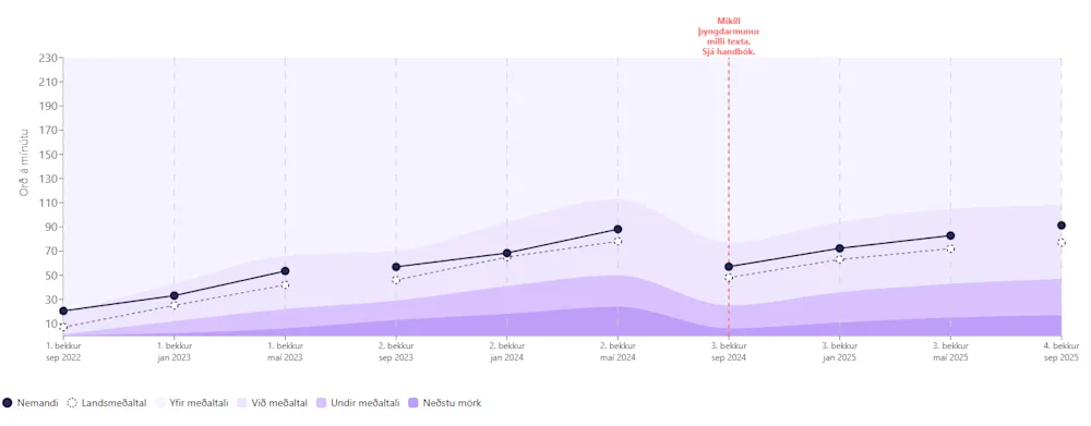 Eins og áður segir eru það ekki lesin orð á mínútu sem skipta höfuðmáli heldur mælitalan ásamt lýsingu á stöðu nemanda. Á myndinni hér fyrir neðan má sjá hvernig frammistaða nemandans helst enn á sama litabili (við meðaltal) þrátt fyrir þann þyngdarmun sem er á prófunum.