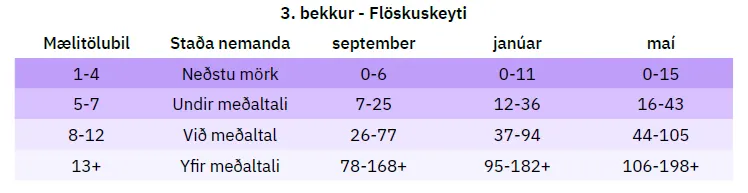 Hér er dæmi um túlkun á niðurstöðum fyrir 3. bekk og hér má finna túlkunarrammann fyrir lesfimipróf allra árganga.