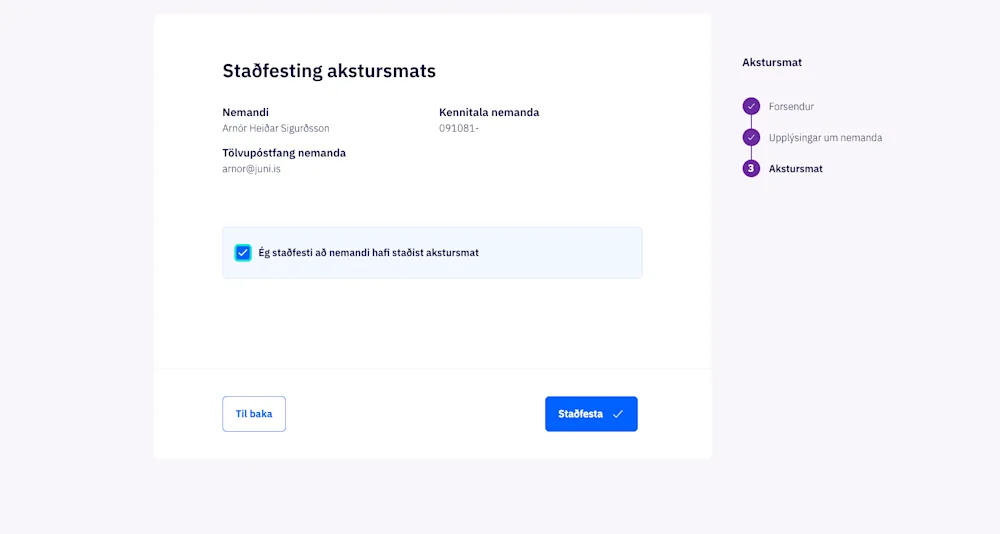 Kennitala umsækjanda og netfang umsækjanda er slegið inn og þá birtist nafn nemandafyrir neðan. Síðan er valið „Halda áfram”.