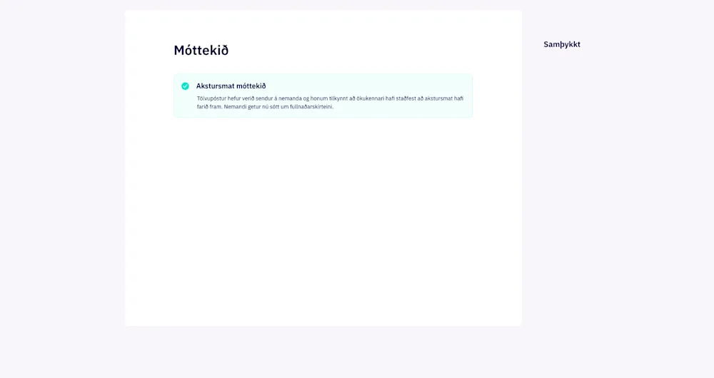 Þegar ökukennari hefur staðfest að akstursmat, fær nemandi tölvupóst og getur hafið umsókn um fullnaðarskírteinið.